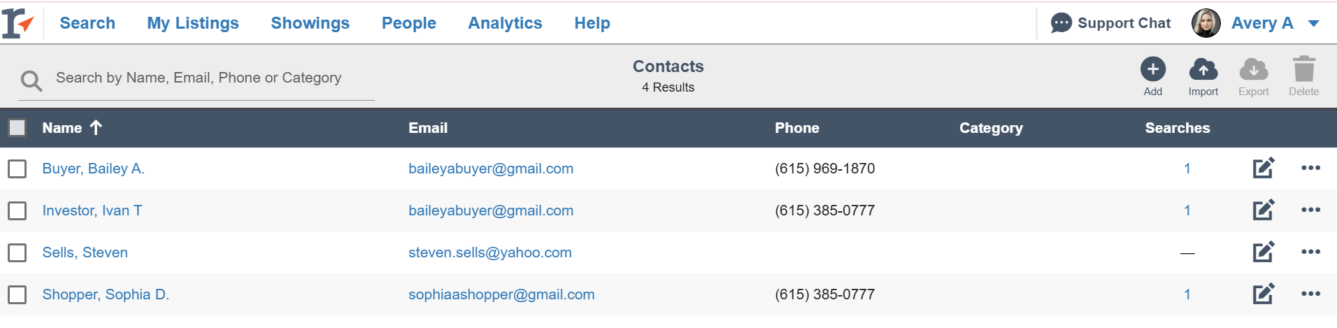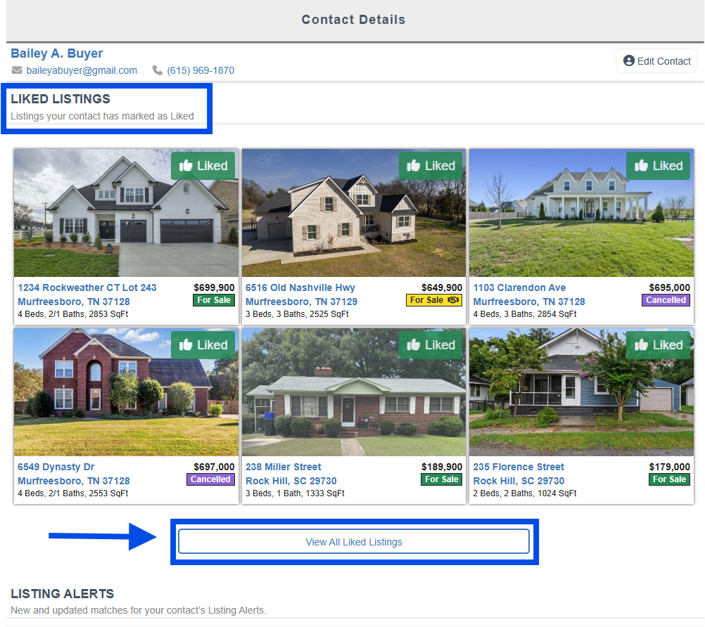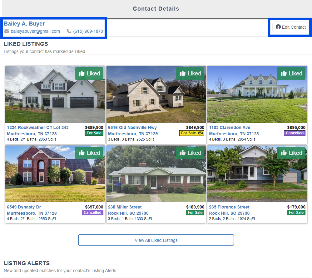 In the Contact Details Page, you will see your contact's information, all their Liked Listings and the Listing Alerts you have created for them.