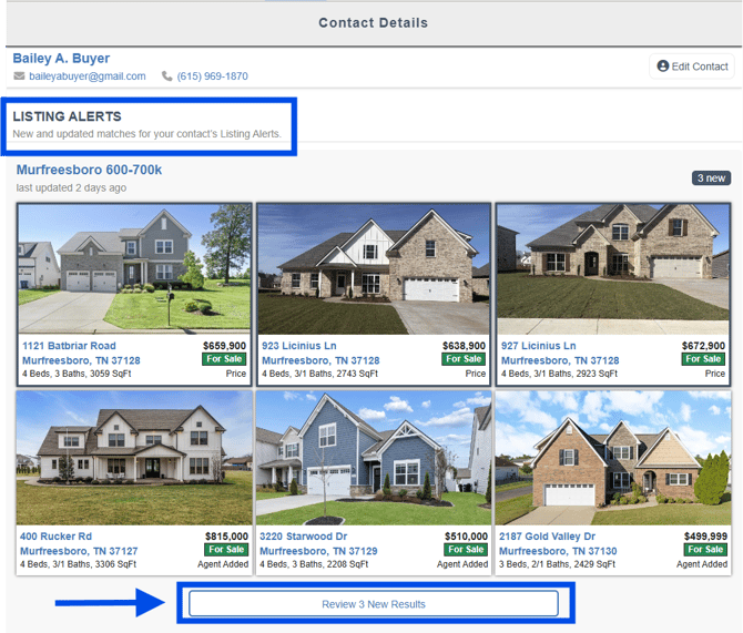 - You will see the new or updated matches for the Listing Alerts that you have created for this contact. To view the new listings, click on the Review New Results button. If there are no new results since the last time you checked, you can still see the previous listings within the Listing Alert by click on the View All Results button.