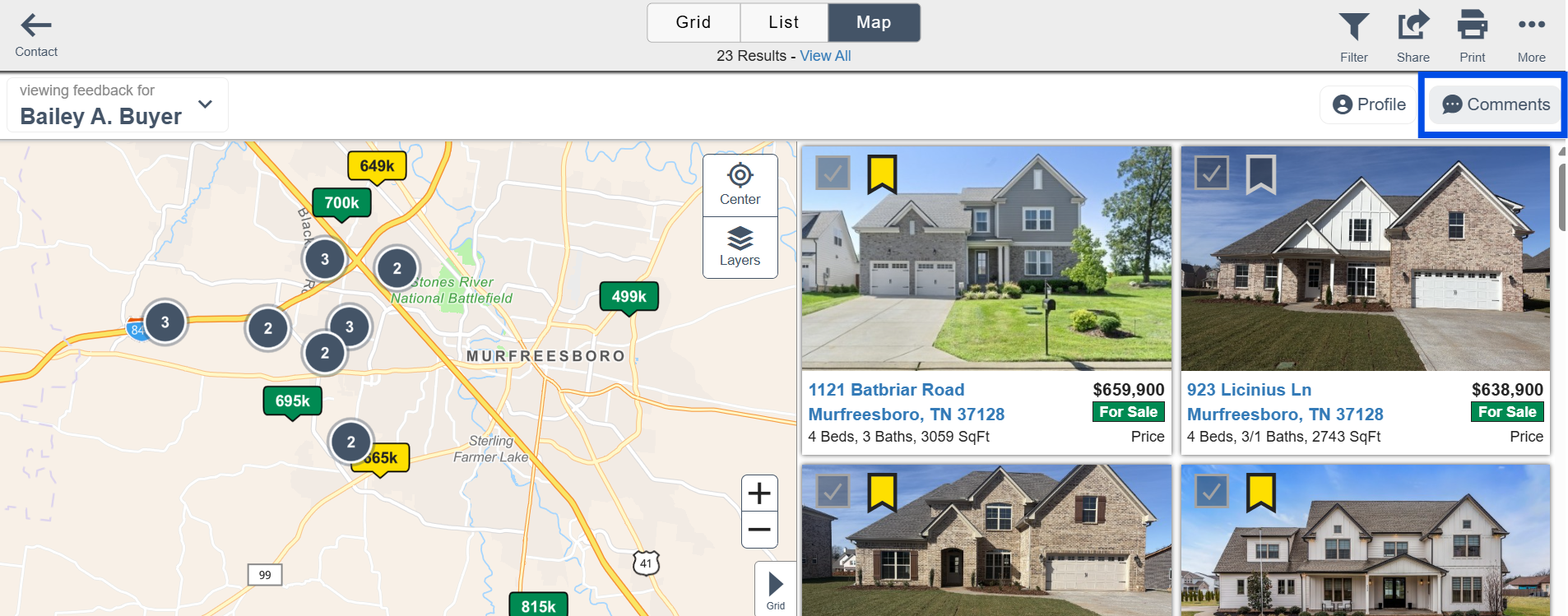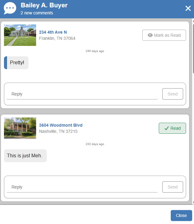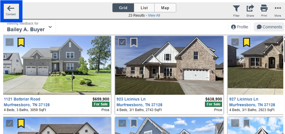 - When viewing the listings, you can also see any comments that the contact left on the listings. To view the comments, click on the Comments button in the upper right corner.