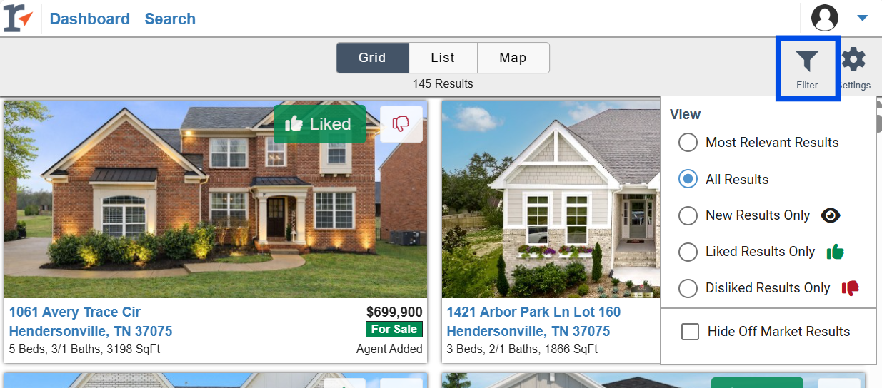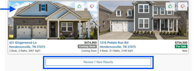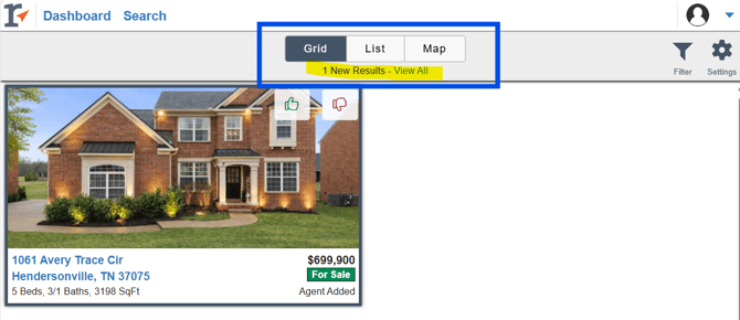 The most recent listing results will be displayed on the dashboard to easily stay on top of the search. To view a listing the client can click on a single listing or click on the View Results button.