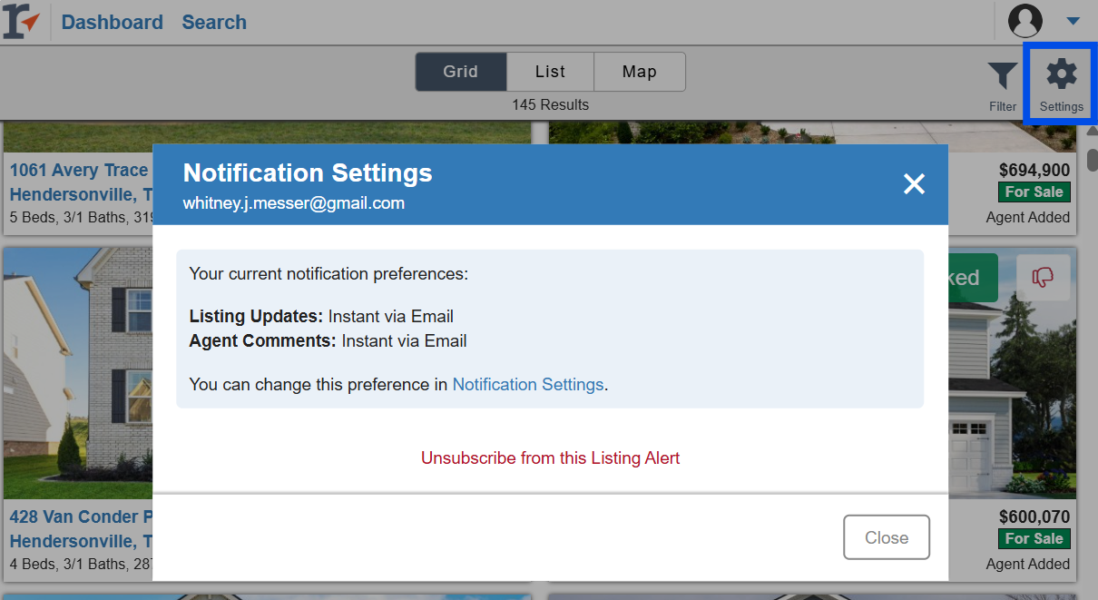 To view their notification preferences for new listing results or comments, click on the Settings icon.