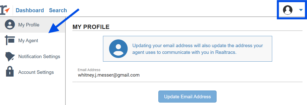 - To access or change any of their account settings, hover over the profile icon in the upper right hand corner. From here they can update their email address, assign a primary agent if receiving listing alerts from multiple agents, change their notification preferences and delete the account.