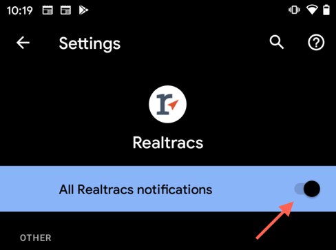 After tapping on Go to Settings, you'll be taken to the Realtracs app settings within the Android Settings application. In the Settings app, tap on Notifications.