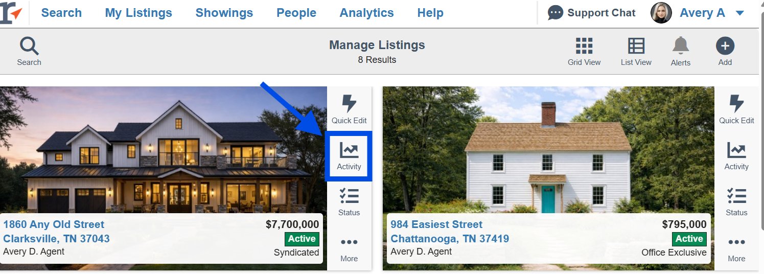 - From Mange Listings, find the listing you want to see the Listing Activity for and click on the Activity button to the right of the listing.