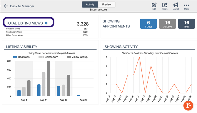 View your listings activity! Total Listing Views is broken down by Realtracs Views, Realtor.com views, and Zillow Group Views. Realtracs Views is composed of public views on realtracs .com, shared Buyer Reports via links, and views from Listing Alerts and the Client Portal.
