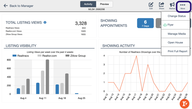 - And use the More menu ( ... ) to: Change the Status of the listing, create a Flyer using the Cloud CMA tool, Manage Media, schedule an Open House, and Print the Full Report.
