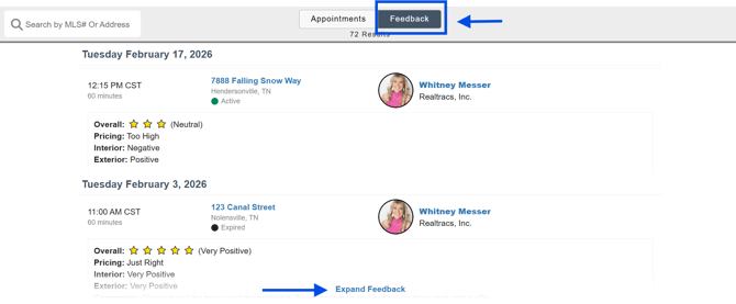 - To see any Feedback left by the Buyer's agent, click on the Feedback button in the top center. To see all the feedback on a specific listing, type in the address in the white search box in the upper left hand corner. Use the Expand Feedback button to see any additional comment's left by. the buyers agent